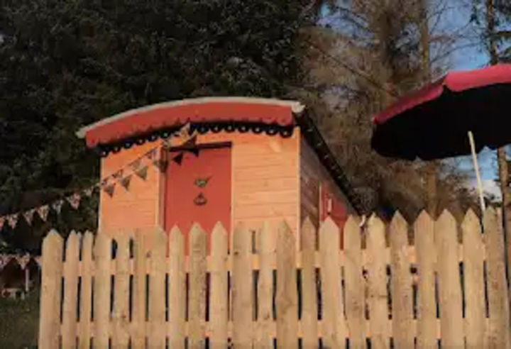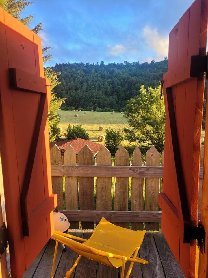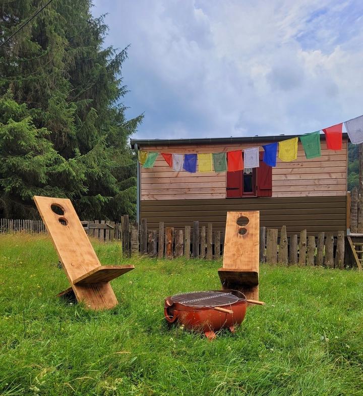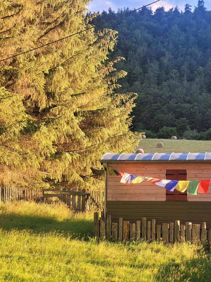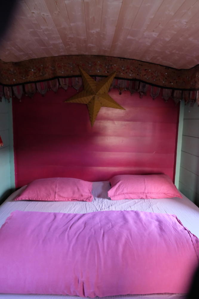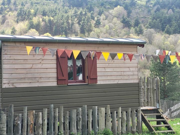 Cette roulotte est pour deux personnes, exposition Sud Ouest. Tout confort, votre lit sera fait à votre arrivée. Terrasse équipée d'une table, de deux chaises et surtout de deux transats pour les siestes et les vues sur les magnifiques et uniques couchers de soleil. Un barbecue est à votre disposition.