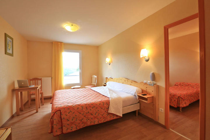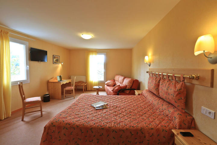 CHAMBRE SPACIEUSE AVEC COIN SALON : 2 à 5 personnes, 24 à 30 m2. Cette chambre spacieuse vous offre un coin salon au calme dominant la vallée de l'Espezonnette. Elle est équipée d'un téléphone, d'une télévision, d'une deuxième prise téléphonique et d'un ascenseur direct. La salle de bains bénéficie d'un sèche-cheveux et d'une baignoire ou d'une douche. Les WC indépendants.