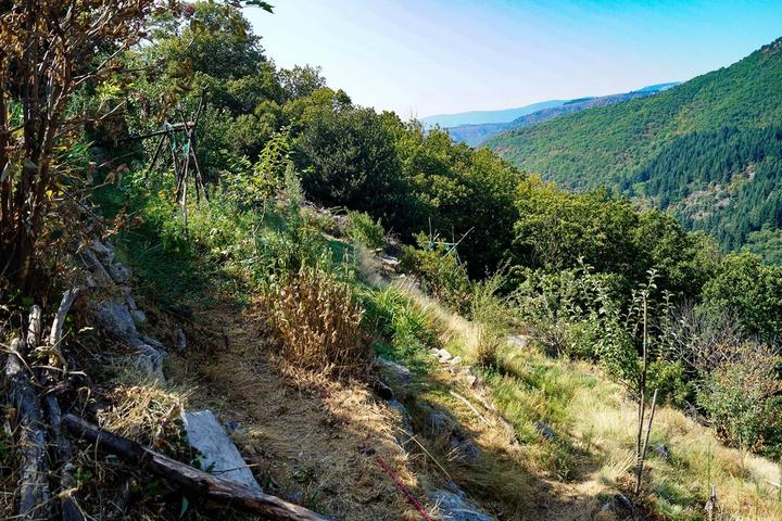 Au Bois Tordu s'étend sur plusieurs hectares entre châtaigneraie en faisses (terrasses typiquement cévenoles) et jardins en agro-foresterie.