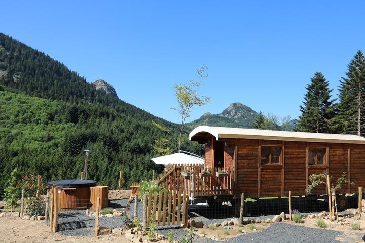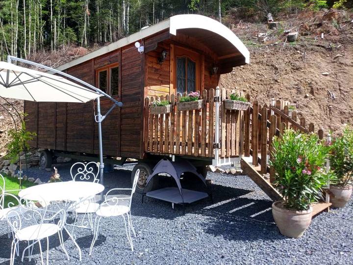 Roulotte équipée 4 saisons, jardin cloturé, bain norvégien privatif vue sur la montagne.