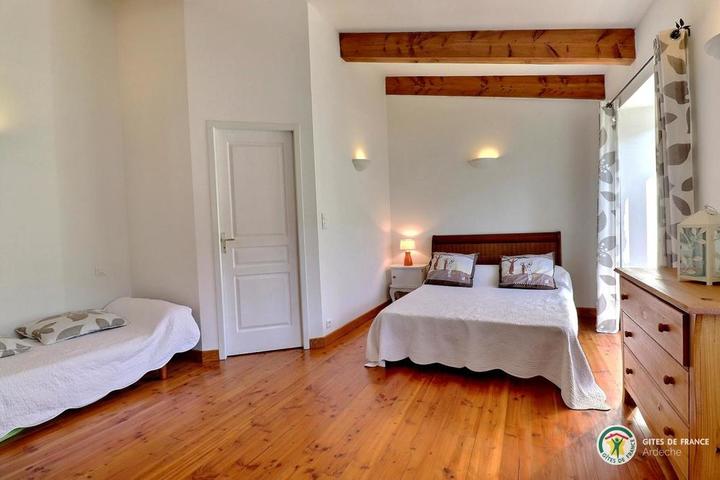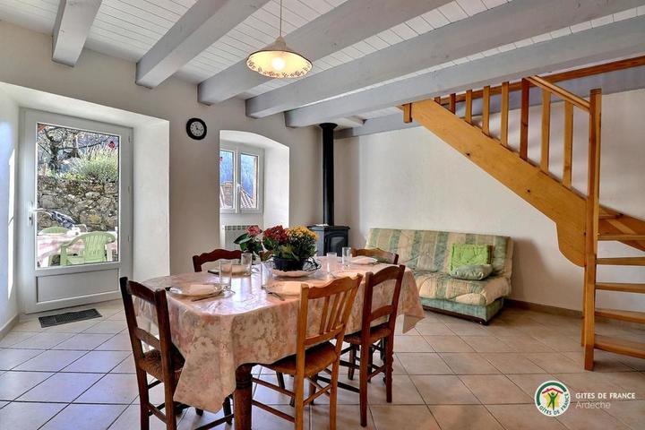 Pour accéder à cette maison de village en pierre entièrement rénovée, vous empruntez une calade en escalier typique des hameaux ardéchois. Vous entrez dans le gîte par une terrasse ou vous pourrez prendre vos repas et faire vos barbecues. En face de cette terrasse, vous profiterez d'un petit jardin idéal pour admirer la vue sur la vallée. Le logement comprend, au rez-de-chaussée, une pièce principale avec une cuisine entièrement équipée, un espace repas avec une table à manger, un écran plat et un poêle à bois. Dans cette pièce de vie, un canapé convertible en 140 cm peut accueillir jusqu'à 2 personnes. À l'étage, vous disposez d'une chambre avec 1 lit 140 cm et 1 lit 90 cm. Cette chambre est équipée de volets roulants, d'une commode et d'une penderie pour le rangement. Vous aurez accès, par cette chambre, à une salle d'eau avec cabine de douche et WC. Draps et linge de toilette à la location. Chauffage électrique compris. Parking sur emplacement privé à proximité.