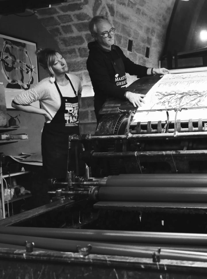 témoignent de la complicité qui s'instaure entre l'artiste et le maître imprimeur lors de la création d'une œuvre sur pierre litho et de son tirage sur presse ancienne.